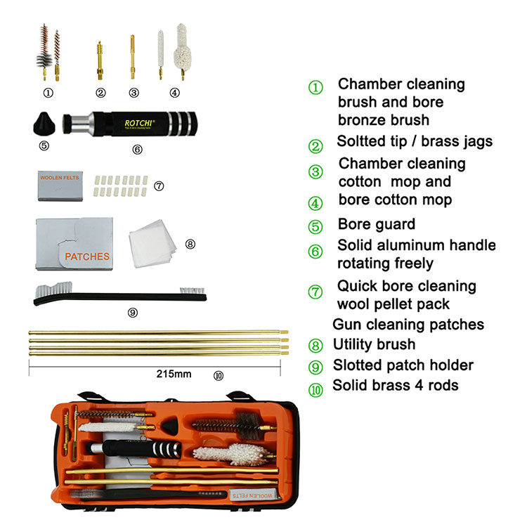 The compact gun cleaning kits provide you the full professional cleaning tools to meet different gun calibers. Blister trays help you collect them regularly. The small volume and the strong case can permit you put them in gun cases or sackbags. The series are without oil bottle in.
