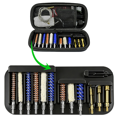 Le kit de nettoyage pour carabine et arme de poing comprend 3 tailles (.22cal. .30cal. 9mm). tissu de boeuf Etui en PVC enduit avec zip. Brosses en laiton, vadrouilles en coton, brosses en nylon, jags en laiton, 5 tiges 1 calbe. Sables et couleur noire au choix.