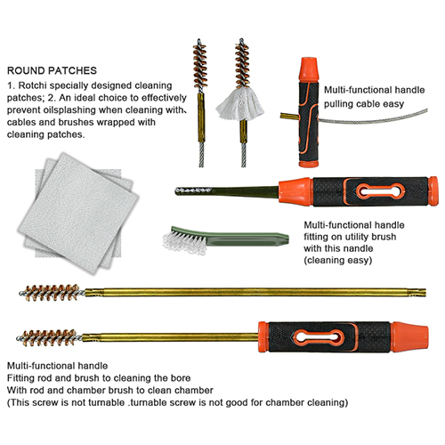 Le kit de nettoyage pour fusil comprend 5 tailles (.177, .22, .243, .27, .30 cal.), des brosses en laiton et vadrouilles en coton, 5 tiges, 2 calbes. Sables et couleur noire au choix.